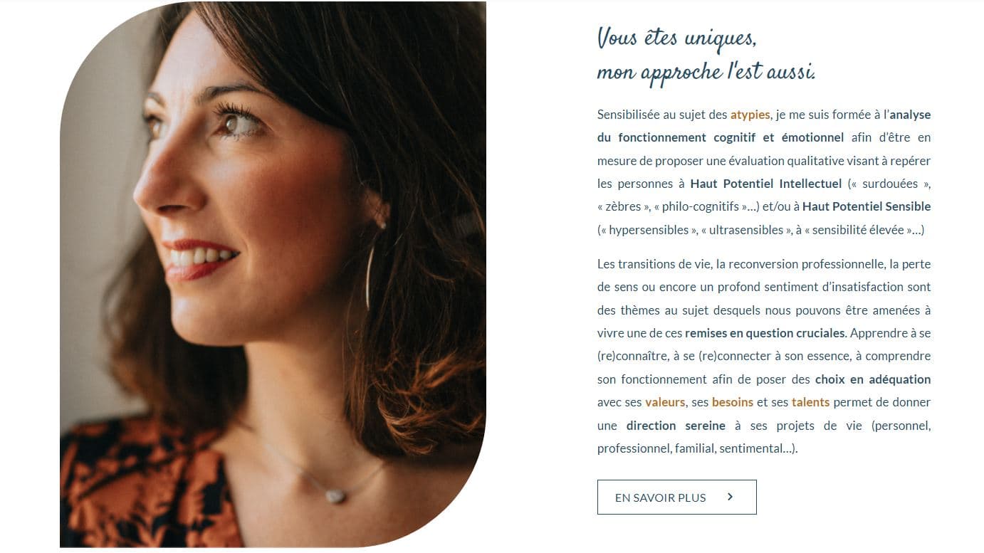 Coach professionnelle certifiée depuis 2020, sensibilisée au sujet des atypies et formée à l’analyse du fonctionnement cognitif et émotionnel,j’accompagne aujourd'hui dans leur démarche de remise en question les femmes atypiques qui se sentent différentes, en décalage ou en recherche de sens.